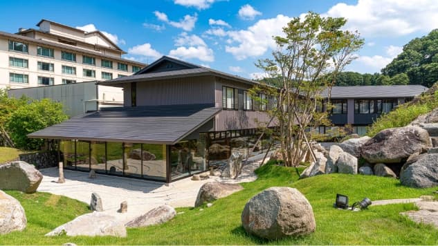 2019年オープンの別館では、町の象徴であるペグマタイトを庭園と大露天風呂に大胆に配置。