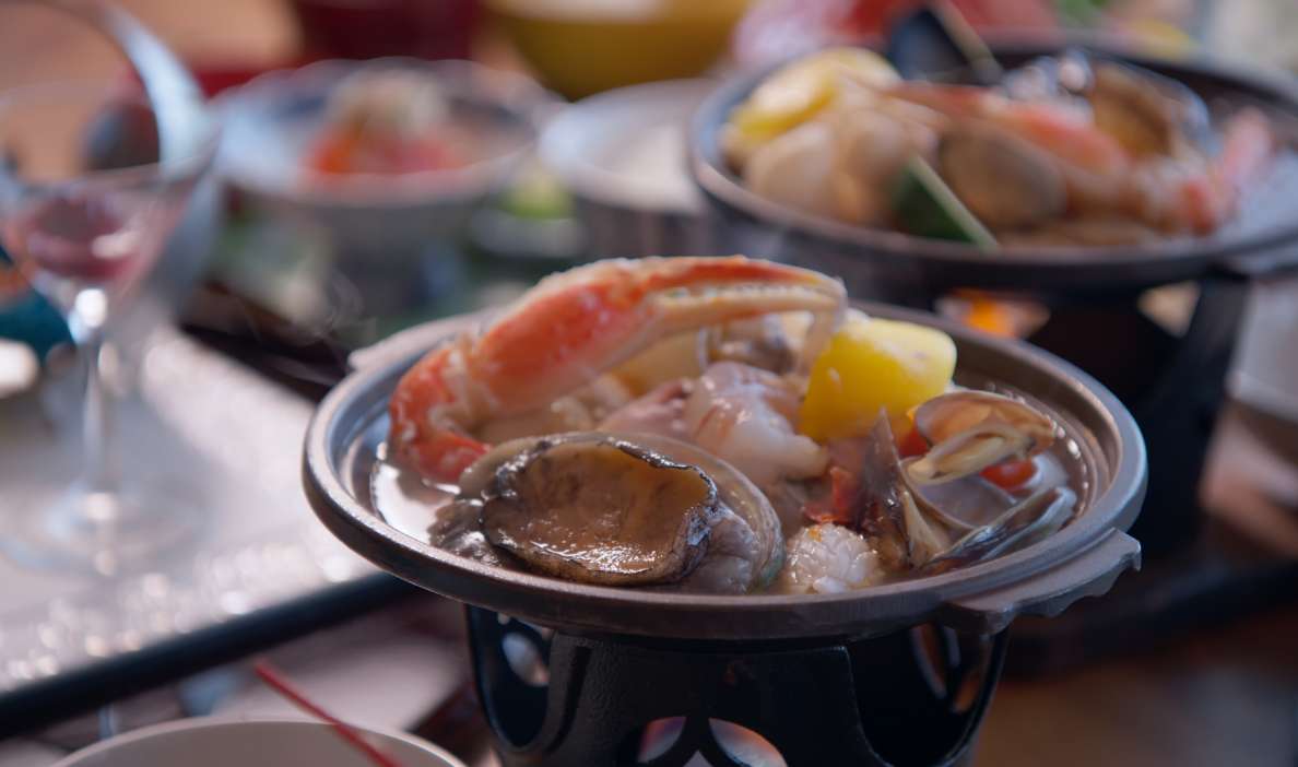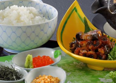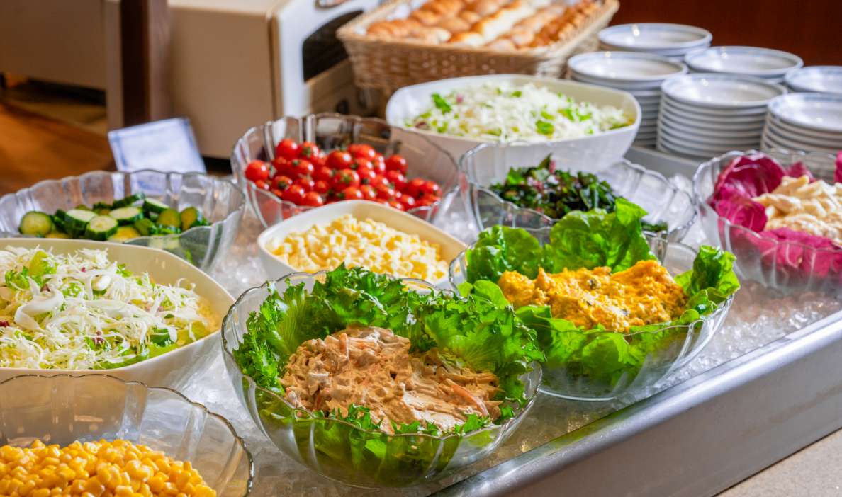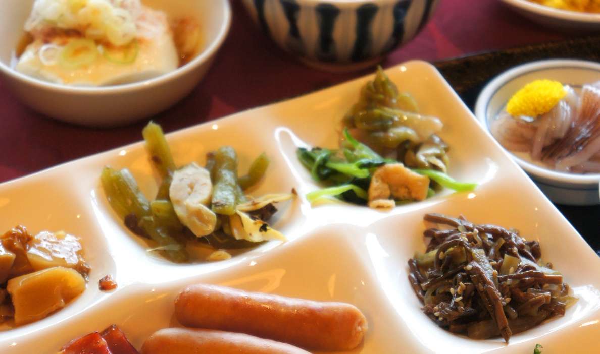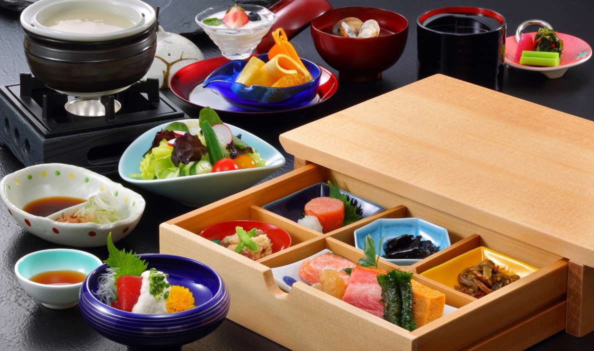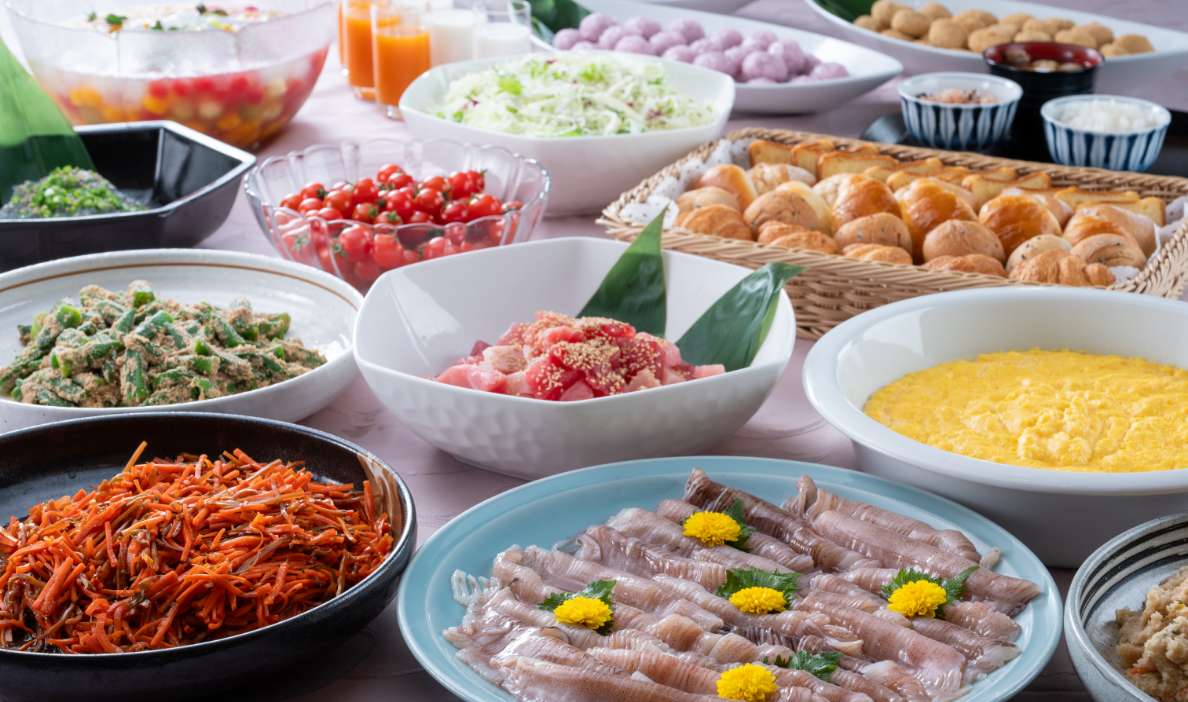 気持ちの良い朝にふさわしいおもてなしとして、和洋折衷のバイキング、または食事処での和食膳をお選びいただけます。季節の野菜や郷土料理を取り入れたバイキングでは、名物「ざっぱ汁」など体にやさしいメニューを豊富にご用意。旅の朝を、心も体もほっと満たすひとときに。