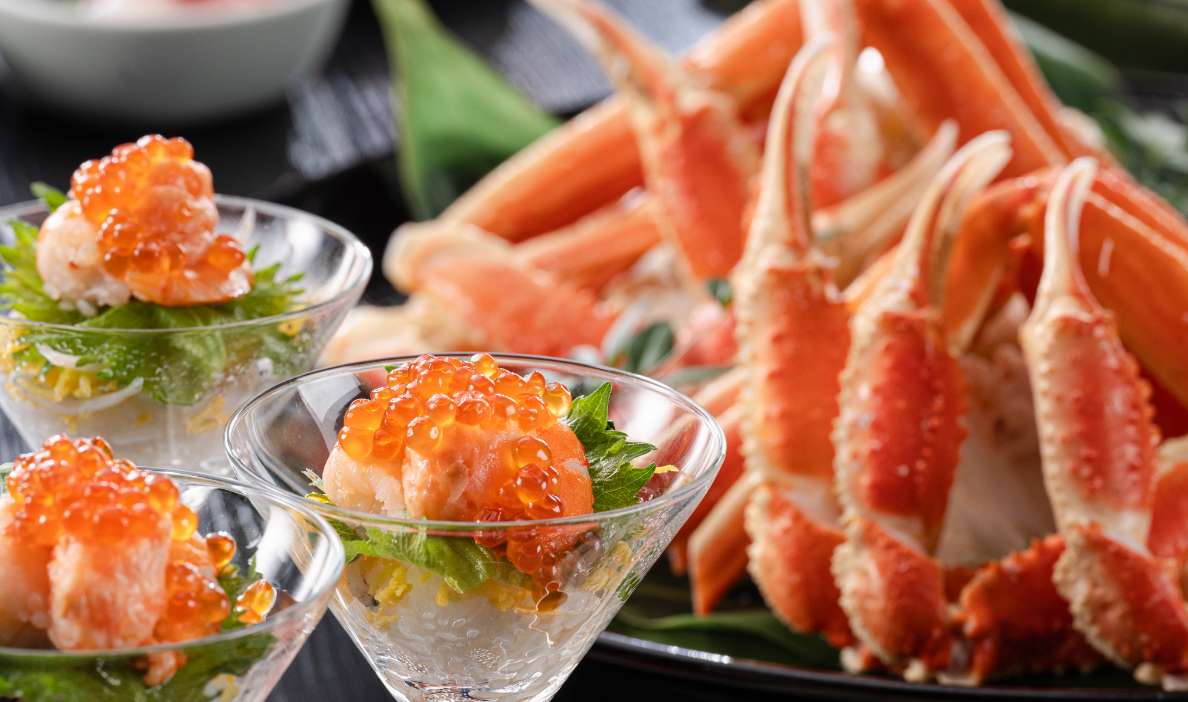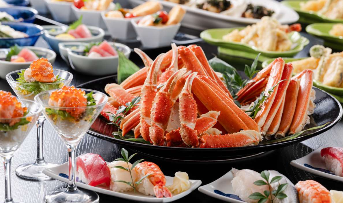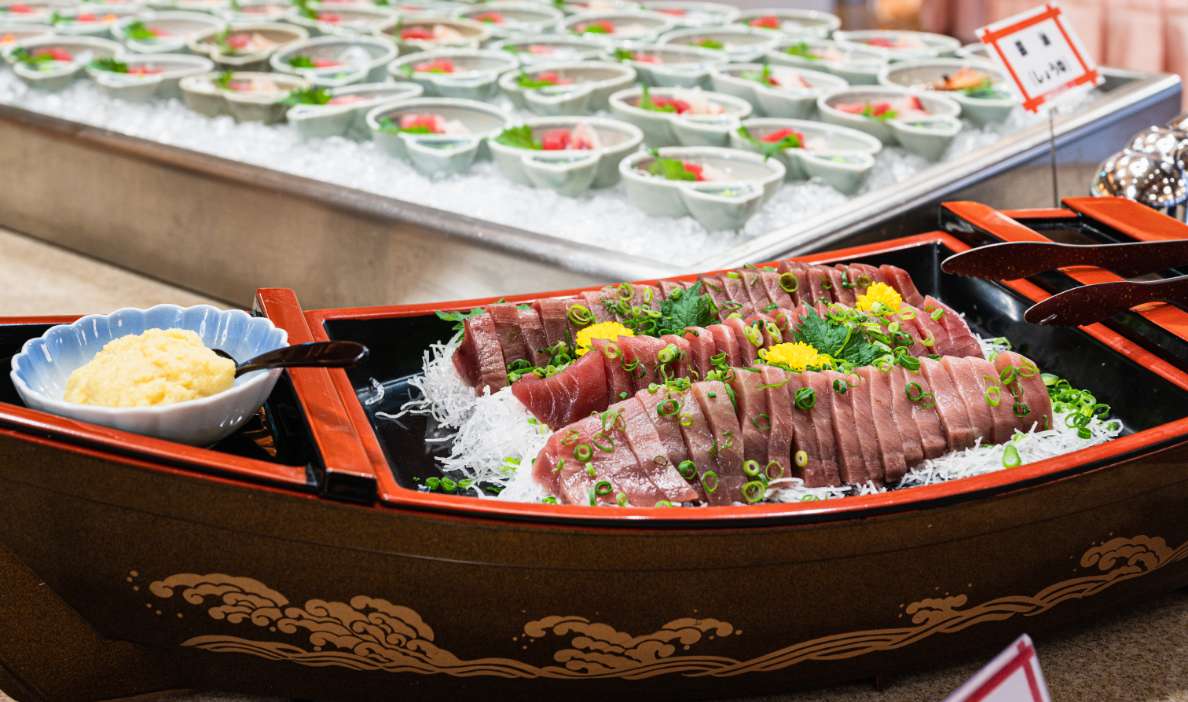 四季折々の旬の食材をふんだんに使った夕食バイキング。和・洋・中の多彩なメニューに加え、目の前で仕上げるライブキッチンもご用意しております。ご家族やご友人と、思い思いにお好きなものを選ぶ時間も旅の楽しみのひとつ。味わいも、会話も弾む、心満たされるひとときをお楽しみください。