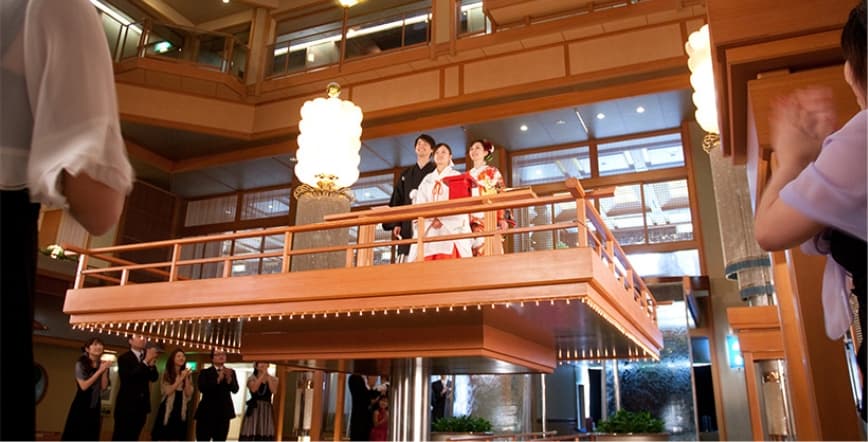 おふたりを乗せ浮き上がる 吹抜浮舞台での誓いを、皆様に証人となっていただきます。
